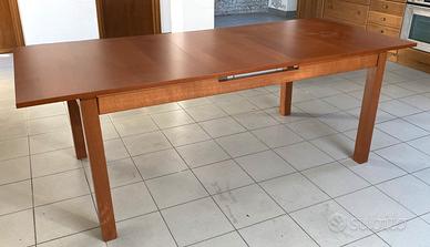 Tavolo da pranzo allungabile, da 6 a 8 coperti. Lunghezza senza prolunga: 170 cm, con estensione: 215 cm, altezza: 75 cm, profondità: 90 cm. (sul piano, il rivestimento ha cambiato colore in un’area di 10 cm x 10 cm) + 6 seggiole molto solide ma di stile diverso.