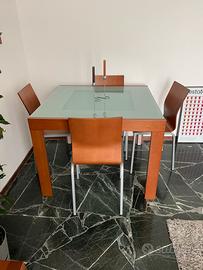 Tavolo allungabile di legno con parte superiore in vetro. Quattro sedie abbinate. 1mt x 1mt da chiuso e 1mt x 2mt da aperto. Oltre al tavolo e possibile acquistare separatamente (ma con uno sconto) la parete attrezzata per la TV, abbinata al tavolo.