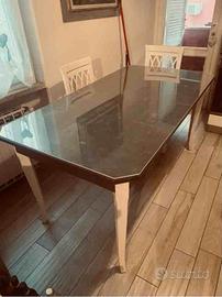 Tavolo da pranzo in legno verniciato dim. cm. 80x160 allungabile fino a 2 metri, completo di piano in plexiglas trasparente. Gambi colore bianco, parte superiore e laterali grigio chiaro. No spedizione Ritiro a carico dell'acquirente