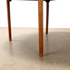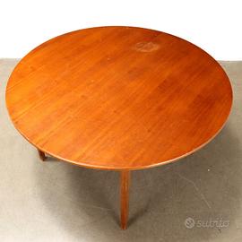 Tavolo da pranzo vintage con piano tondo. In legno impiallacciato teak.