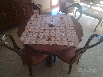 Vendo elegante tavolo da pranzo degli anni ’70 in legno massello scuro, con gambe tornite e intagliate, completo di 6 sedie originali con seduta imbottita in velluto rosa.