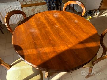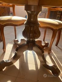 Elegante tavolo da pranzo antico in legno massello, di forma rotonda, caratterizzato da una splendida base centrale tornita con piedi sagomati, tipica della produzione artigianale di fine XIX / inizi XX secolo.