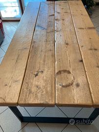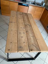 Tavolo realizzato con assotti da cantiere; spazzolati e trattati con impregnante trasparente e gambe in ferro. Misure: 170x85, altezza 77.