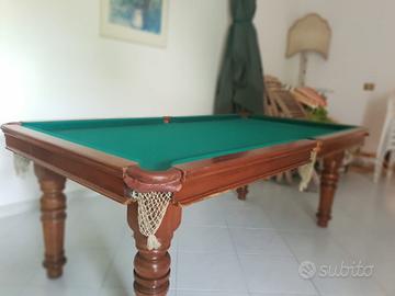 Rarissimo tavolo inglese in mogano d’antiquariato che si trasforma in biliardo, con un meccanismo che lo alza, completo di stecche antiche e palle. Misura chiuso 197x104, aperto 176,5 x85. Diametro buche 7 cm.
