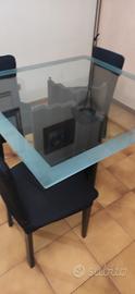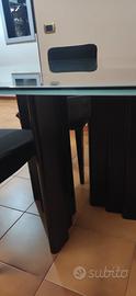 tavolo da pranzo in cristallo con bordo satinato e base in legno nera cm.120x120, angolo leggermente crinato come da foto. 4 sedie in Alcantara nere. Ritiro a vostro carico,no spedizione.€ 200,00