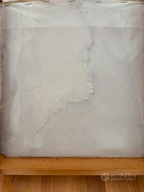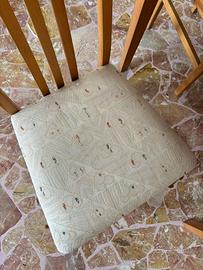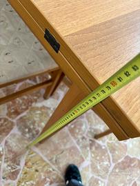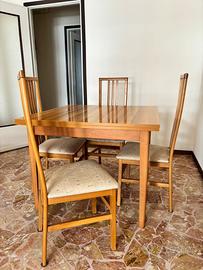 Set da pranzo vintage composto da un tavolo quadrato (1x1 m) allungabile fino a 2 metri, realizzato in impiallacciatura di noce biondo. Il set include quattro sedie coordinate con schienale alto a listelli e seduta imbottita in tessuto panna. Il complesso è in buone condizioni estetiche, fatta eccezione per una sedia che presenta la seduta leggermente sfondata (come da foto del sottoscocca) e necessita di un semplice intervento di ripristino.