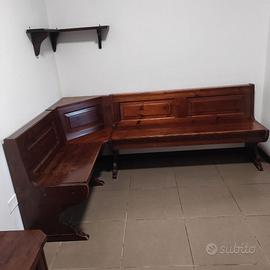 Vendo tavolo da pranzo (o sala) in legno massiccio, con seduta a muro (sempre in legno) e 3 sedie. Inoltre aggiungo cassapanca in legno, per una cucina (o sala) dal sapore vintage. Buono stato di conservazione, come da foto.