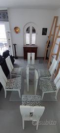 Magnifico tavolo da pranzo con gambe blanche su base in acciaio inox e piano in vetro. Dimensioni 180 x 90 cm. 6 sedie in legno bianco da abbinare al tavolo.