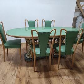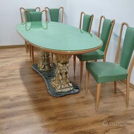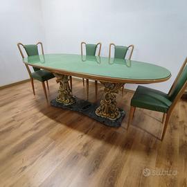Descrizione: Vendo un tavolo da pranzo autentico degli anni '40, realizzato da La Permanente Mobili Cantù, un'icona dell'artigianato italiano. Questo pezzo unico combina influenze barocche e Art Decò, rappresentando un perfetto equilibrio tra tradizione e innovazione. La base in marmo grigio sostiene due costoni curvilinei in legno scolpito e laccato, che conferiscono al tavolo un aspetto scultoreo e raffinato. Il piano ovale, di generosa profondità, è rivestito in vetro verde, con un sottorivestimento in foglia di pergamena che ne esalta la luminosità e il design esclusivo.
