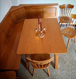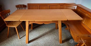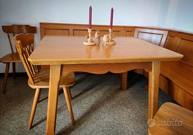 Tavolo da pranzo estensibile in legno massello di rovere parte di una parure di pregio in stile country di colore biondo medio che gli dona un'aura calda e accogliente.La finitura a poro aperto esalta le splendide venature naturali del rovere.Il tavolo di forma rettangolare è dotato di un sistema di estensione con due prolunghe laterali accompagnate da un meccanismo di supporto nella sezione centrale che le mantiene in sede quando si decide di allungarlo,e quando invece si preferisce tenere la posizione standard. Il tavolo (come il resto del set) è un pezzo di falegnameria di alto artigianato sud-tirolese fabbricato su misura ed è in condizioni ottime,fatto per durare nel tempo in materiale di altissima qualità quale è il rovere massello.