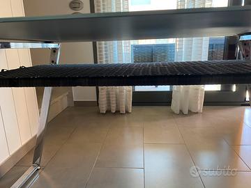 Vendo tavolo da pranzo per terrazze e giardino ma adatto anche per interni, sala o cucina. Il tavolo ha il piano in vetro temperato e satinato e ha in ripiano sottostante in rattan utile come appoggio. La struttura è in acciaio. Misure 160x90h75.