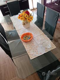 Vendo, a seguito di trasferimento, tavolo da pranzo in cristallo per 6 persone (ottimo anche come tavolo da rappresentanza per sala riunioni) con sei sedie in ferro, della misura di: lunghezza m. 1,90 - larghezza cm. 94 - altezza dal pavimento cm. 75. Presenta piccola scheggiatura su un bordo.