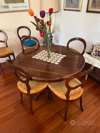 Vendo elegante tavolo da pranzo antico in legno artigianale italiano con 4 sedie coordinate.