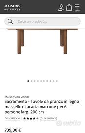 Tavolo da pranzo in legno massello di acacia marrone lung. 200cm SACRAMENTO!