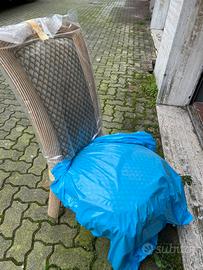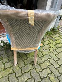 In abbinamento 4 poltroncine con medesima struttura e finiture, imbottitura su seduta e schienale con tessuto pregiato. Misure indicative 55x60, h schienale 85 cm.