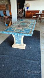 Tavolo da pranzo italiano anni ’80 con piano in marmo a commesso (intarsio lapideo), produzione artigianale italiana, distribuito da CONSOLO.