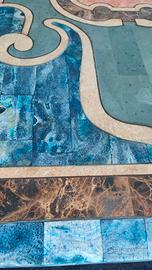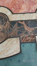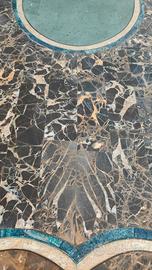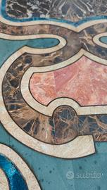 Il piano è realizzato con marmi policromi e pietre dure, lavorati con tecnica tradizionale a tasselli, con disegno decorativo centrale e cornice perimetrale.