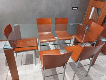 Vendo tavolo con 6 sedie,lungo 1.80 x 90 cm,color ciliegio, molto massiccio,il vetro presenta qualche graffio ,come le sedie. Vendo per passaggio a tavolo più piccolo,prezzo trattabile. Smontaggio, trasporto e montaggio a vostro carico. Possibilità di comprare singolarmente il tavolo o le sedie.