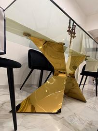 Vendo elegante tavolo da pranzo dal design contemporaneo, con piano in vetro trasparente e struttura solida con base scenografica.