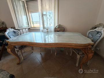 Tavolo stile shabby, copertura in vetro effetto marmo, misure lung1,90 larghezza 1mt x 80H. Il tavolo è situato al 3°piano, trasporto e ritiro a carico acquirente prezzo trattabile