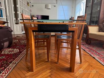 vendo causa trasloco tavolo di DESIGN in legno e vetro trasparente ed acidato dotato di due prolunghe in legno della misura di 160/240x90x75cm altezza, in buono stato. consegna a mano a Treviso. Possibilità di acquisto anche delle 4 sedute in foto, a parte.