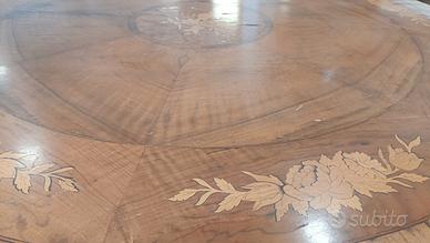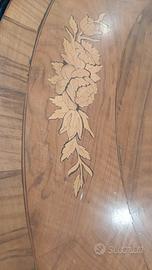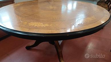 Tavolo da pranzo tondo stile Carlo X risalente alla seconda metà dell' 800. La struttura portante fusto centrale e i tre piedi sono realizzati in legno di noce. Il piano circolare presenta intarsi con motivi decorativi vegetali e floreali realizzati con legni più chiari tipo acero o ciliegio per creare un contrasto cromatico con il fondo più scuro. Dimensioni: diametro mt.1,350 - altezza mt. 0,790.