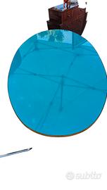 Un magnifico piano ovale in spesso cristallo, retroverniciato in una vivace e ipnotica tonalità turchese/celeste. La superficie è perfettamente lucida e funge da specchio, creando affascinanti giochi di riflessi (come visibile nelle foto, dove si riflettono alberi e architetture esterne mis 160x90