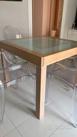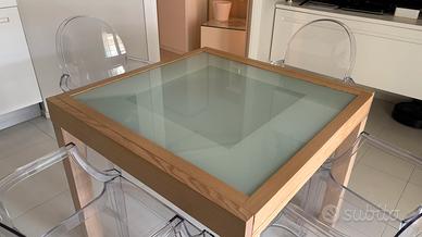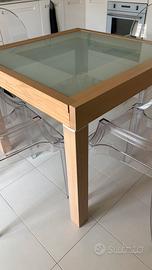 Tavolo in legno e vetro. Allingabile. Chiuso 90x90. Allungato 90x180