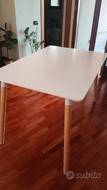 Tavolo da pranzo rettangolare. Misure 120 x 80 x 75 h Spessore del piano 18 mm Colore bianco Gambe color legno Gambe smontate. Buono stato, normali piccoli segni dettati dall'uso. Ritiro a Milano in via Adriano.