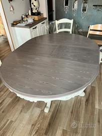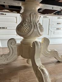 Tavolo da pranzo rotondo allungabile in stile classico shabby chic, piano effetto legno grigio venato, base centrale tornita color avorio anticato. Ritiro in loco a Casavatore (NA).