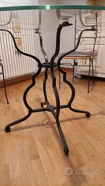 Vendo tavolo da pranzo rotondo, altezza 75 cm, con piano in vetro diametro 120 mm. e spessore 10 mm, con base robusta in ferro battuto, corredato da 4 sedie con telaio sempre in ferro battuto e seduta in rattan naturale.
