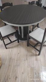 Struttura solida in legno scuro, piano del tavolo effetto legno wengé, sedie con seduta imbottita chiara in buono stato.
