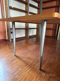 ampio tavolo rettangolare in legno chiaro con 4 gambe in acciaio, utilizzabile come comoda scrivania o come tavolo da pranzo per 4/6 persone. in regalo sedia regolabile in altezza con rotelle. L150 P100 H74. le gambe del tavolo possono essere svitate per trasportare il tavolo più facilmente. disponibile solo con ritiro a milano centro cap 20123