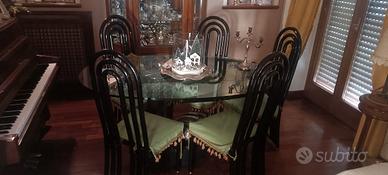 Tavolo ovale in cristallo allungabile con base in marmo nero, 5 sedie e un tavolino in cristallo base marmo in buone condizioni. Margine di trattativa.