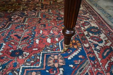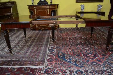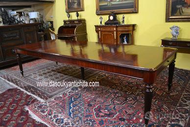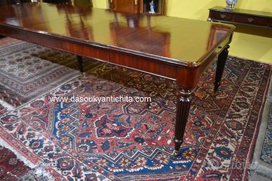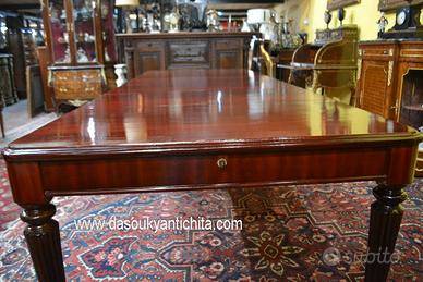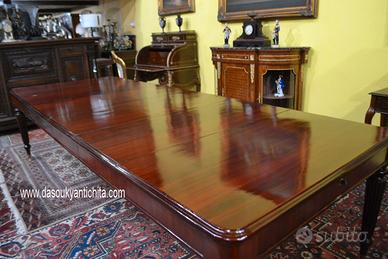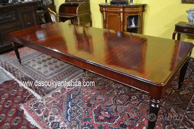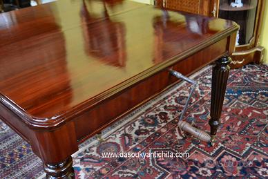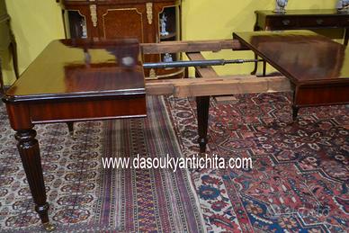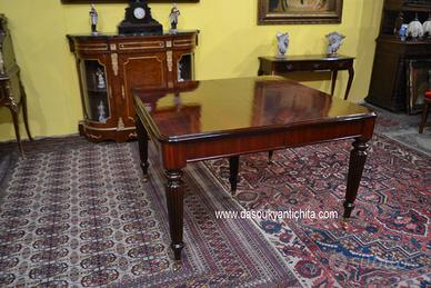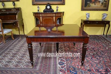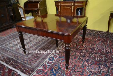 Splendido tavolo quadrato da pranzo in stile inglese vittoriano lastronato in mogano , facilmente allungabile grazie al meccanismo di apertura scorrevole con manovella, composto principalmente da guide e binari in legno che permettono alle due metà del tavolo di scivolare l’una rispetto all’altra e una barra in ferro centrale, creando uno spazio centrale dove possono essere inserite fino a quattro allunghe , sostenuto da cinque gambe tornite e scanalate , che terminano su splendide rotelle in ottone.