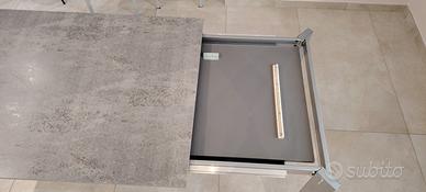 Piano in vetro temperato effetto grigio cemento con prolunga integrata.