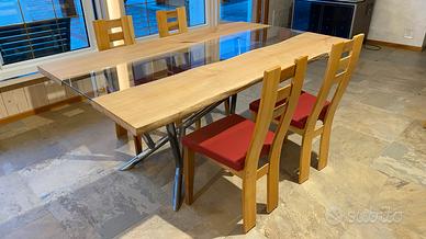 Dimensioni 194 x 110 x H 79 cm. Piano in tavole di legno di ciliegio da 4/5 cm, con finitura a olio naturale e vetro sagomato da 8 mm. Struttura in tubi di ferro da 4 cm con finitura sverniciata lucida. Sedie non in vendita.