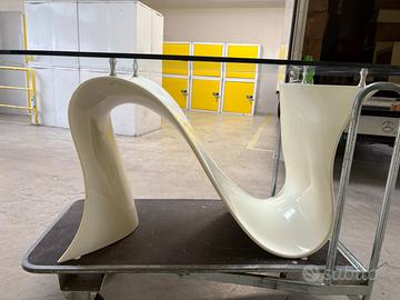 Vendo splendido tavolo da pranzo di modernariato, icona dello stile Space Age degli anni '70/'80. Il tavolo si distingue per la sua straordinaria base scultorea in vetroresina (fiberglass) bianca, caratterizzata da linee fluide e sinuose che creano un gioco di curve unico da ogni angolazione.