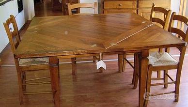 tavolo da quadrato allungabile realizzato in rovere massello, con un design specifico che si apre "a libro" trasformandosi in un ottagono o un quadrato più grande.