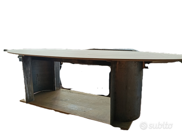 base in ferro lasciato naturale. doppio top in MDF, lasciato al naturale. pronto per eventuali finiture, oppure utilizzabile come e' ora al grezzo. stabile e robusto. le foto sono scontornate xche' il tavolo si trova in magazzino. eventualmente chiedetemi le foto al naturale. ritiro a Parma. piano strada.