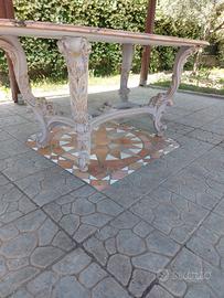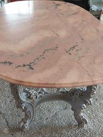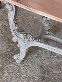Tavolo da pranzo-sala-salotto-soggiorno, stile rococò/veneziano, in legno massello intagliato color grigio chiaro/oro con piano in marmo Rosa di Portogallo, molteplici venature, bordo arrotondato,ideale per boutique 195x95 h80