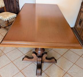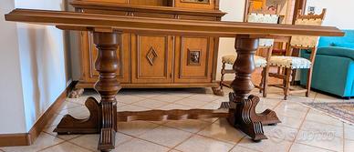 Tavolo da sala di circa 60 anni, con sei sedie coordinate, rivestite di tessuto setoso, fermato da borchie. Misura 187 cm di lunghezza, per 95 cm di larghezza, per 80 cm di altezza.
