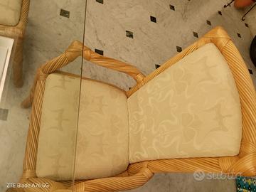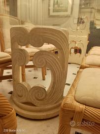 vendo tavolo da sala 12 posti in cristallo con base in pietra e sedie in bambu. le sedie sono con una stoffa color avorio e intarsi dorati.