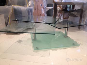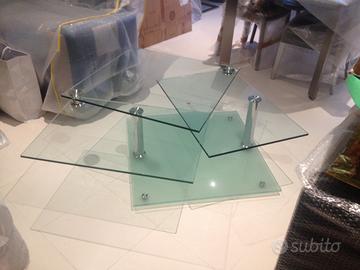 Tavolo da salotto in vetro, struttura in acciaio cromato, allunghe laterali in vetro che ruotano conferendo al tavolo forme diverse di design come se fosse un'opera d'arte. Misure 80x80 h42 (160x80 h42). Il tavolo è nuovo in quanto fa parte di rimanenze a seguito chiusura negozio arredamento. Affare.