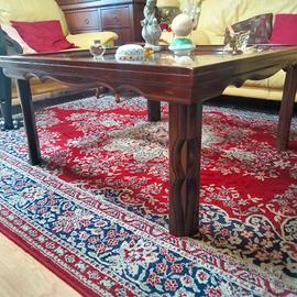 Slendido tavolo da salotto quadrato in legno massello e vetro soffiato ,fatto a mano .le condizioni sono eccellenti,no tarli,le misure sono h 49 97 cm per 97cm. possibile consegna gratuita zona Perugia e dintorni.