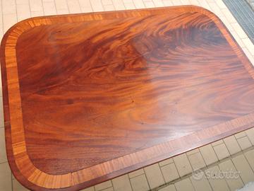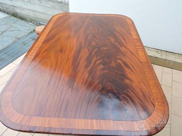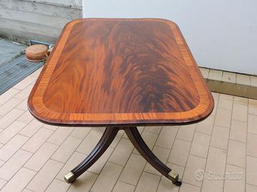 Tavolo con piano in piuma di mogano regency massiccio, con bordo a fasce incrociate su colonna tornita e base in legno di mogano.