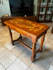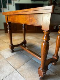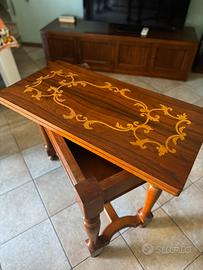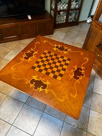 Splendido tavolo in legno con raffinati intarsi decorativi, perfetto per chi cerca un pezzo unico che unisce eleganza e funzionalità. Il piano superiore presenta un motivo intarsiato di grande pregio che, una volta aperto, rivela una superficie quadrata con una scacchiera centrale integrata: ideale per momenti di relax e convivialità. 🔹 Caratteristiche principali: •Tavolo richiudibile/estensibile •Piano con intarsio artigianale •Scacchiera integrata all’interno •Vano interno utile per riporre accessori •Struttura solida con gambe tornite •Finitura lucida che valorizza le venature del legno 📏 Dimensioni: •Chiuso: 90 × 45 cm •Aperto: 90 × 90 cm •Altezza: 78 cm 📍 Perfetto come tavolino da salotto, ma anche come elemento d’arredo distintivo per studio o zona relax. 💡 Un complemento d’arredo elegante e funzionale, ideale anche come idea regalo per appassionati di scacchi o mobili classici.