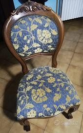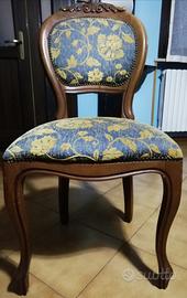 Tavolo in legno vintage, con 6 sedie coordinate e rivestite sia sulla seduta che nello schienale. Tutto in stile classico ed elegante.