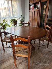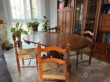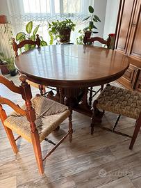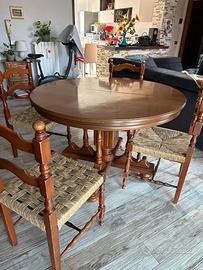 Tavolo in legno antico da soggiorno con 4 sedie sempre in legno. Tavolo allungabile tondo