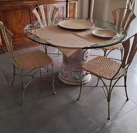 tavolo in cristallo spessore da 1,5 cm, diametro da 130 cm ,basamento in cotto più 4 sedie in ferro battuto abbinate con i colori del basamento .